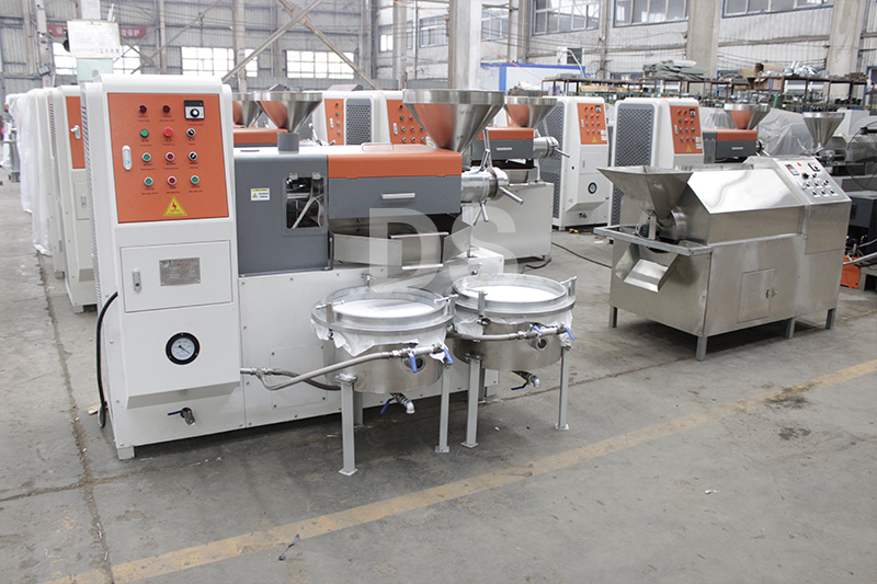 3.使用多的是螺旋榨油機,螺旋榨油機有大中小型。主要組成結構有壓料結構、齒輪減速箱、榨膛、榨螺和機架組成。齒輪箱通過榨膛與機架連在一起,裝于基座之上,讓螺旋榨油機成為一體。榨油工藝:原料→炒籽→壓榨→過濾。油液從榨條、榨圈的縫隙流出,油餅從出餅圈擠出,油渣從排渣口排出機體外。