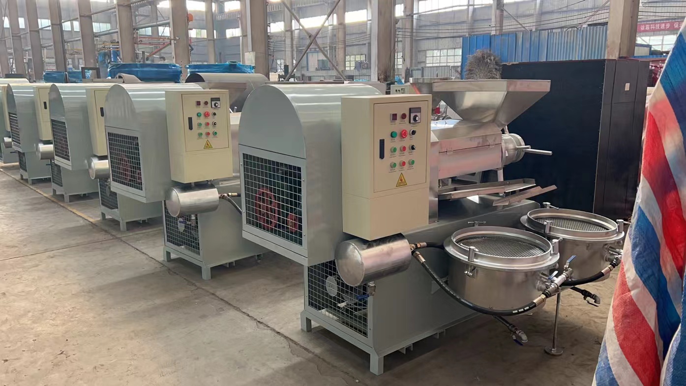 7.新榨油機安裝后進行4—8小時磨榨,方法是用已榨干油的餅料從料斗中緩緩喂入,反復回榨,使榨膛磨光,切記開始磨榨不要將料直接倒入料斗內,而以手抓喂入為宜,以防榨螺軸卡死。如喂料過猛,榨膛內出現異常響聲或榨螺軸卡死,應立即停車,消除梗阻,或重新裝配好后再啟動磨榨,嚴禁強行拖車。8.正常榨油時,必須保持進料均勻,切勿過多過少或斷料空轉。此時機器負荷正常,運轉平穩,響聲有節奏。出餅順暢,低壓段基本無渣,高壓段有少量油渣,但渣在油中的比例不大于10%,榨膛內溫度可達150—200℃,出餅口出冒出青煙應通過護罩由抽煙管排出。榨出熱餅要及時攤開,不要急于打堆或裝運,否則會產生自然現象。當連續工作時間較長,機溫過高時,應采取電扇吹風等降溫措施。